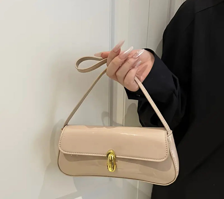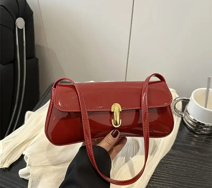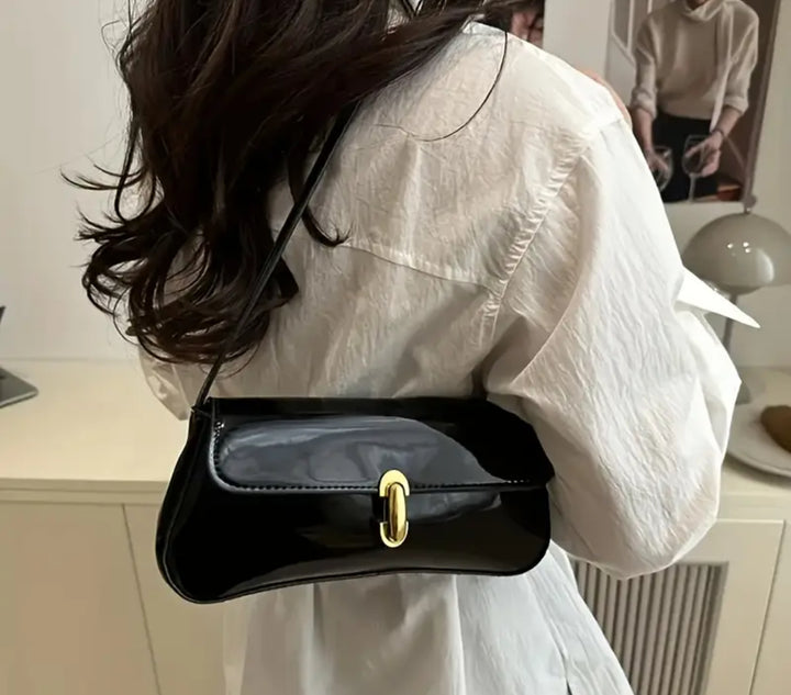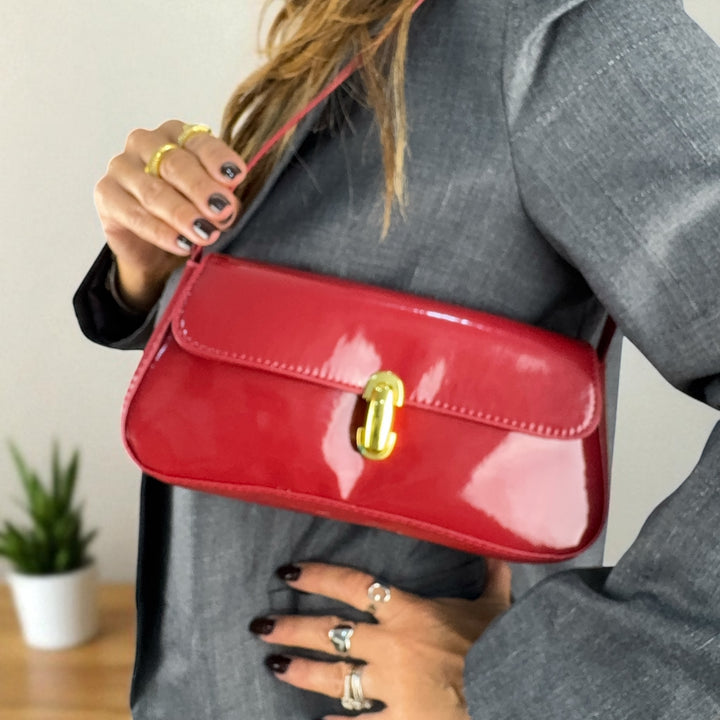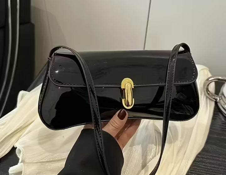Borsa a spalla super Chic in similpelle lucido. Dimensioni (25×12×3,50 cm), pratica chiusura a girello con hardware dorato, elegante da portare sia a mano che a spalla.
